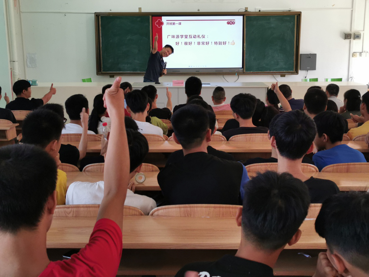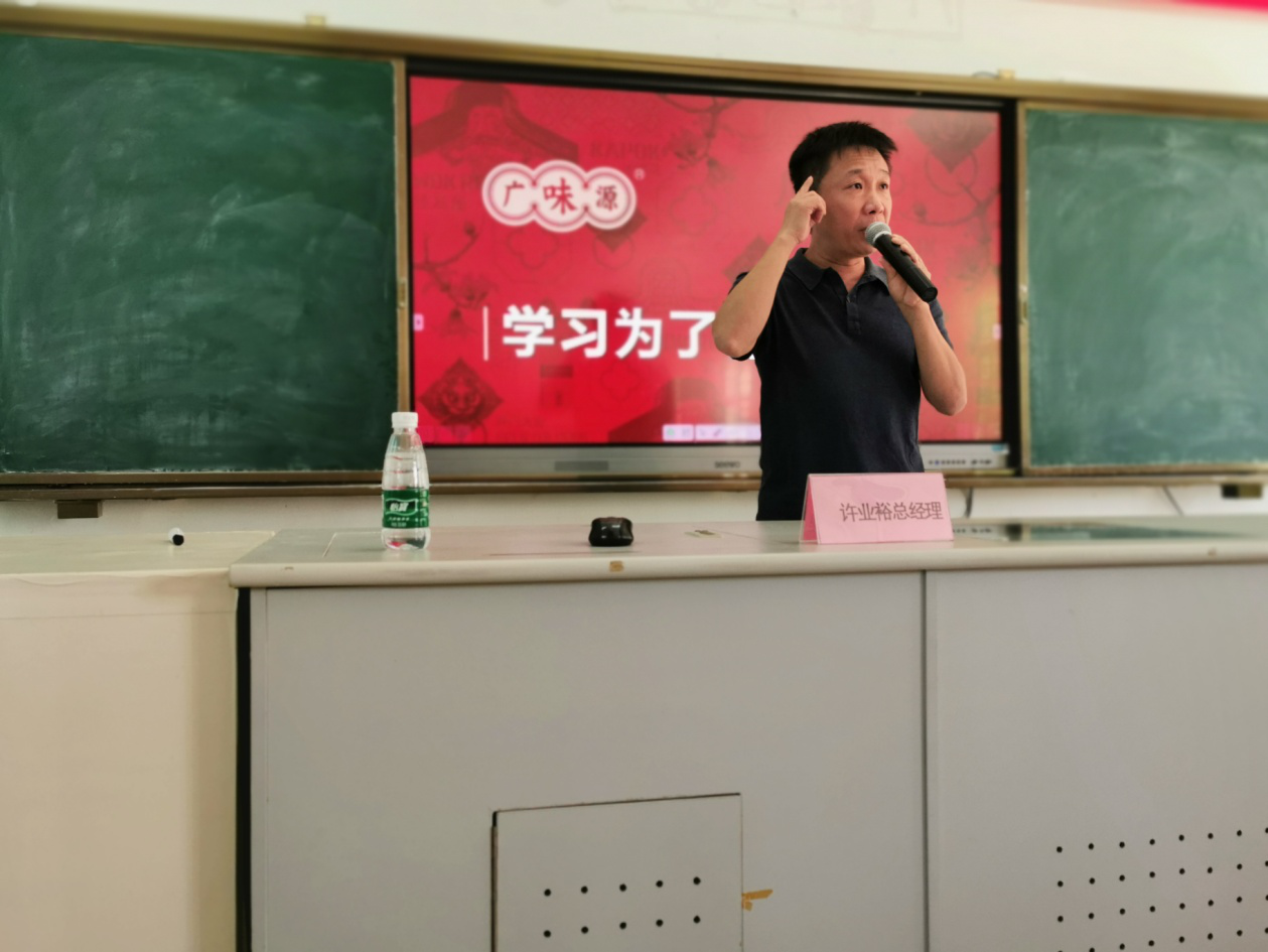 隨后,許業(yè)??偨?jīng)理為廣味源班的同學(xué)們上了精彩的開班第一課。課上,許總在重點(diǎn)介紹到廣味源公司與華南理工大學(xué)開展教、學(xué)、研全方位合作時(shí),邀請(qǐng)林偉鋒博士和陳中教授為同學(xué)們致辭,兩位老師都表示一定會(huì)不遺余力地配合此次的課程設(shè)計(jì),并對(duì)廣味班的同學(xué)們提出了殷切的期望。