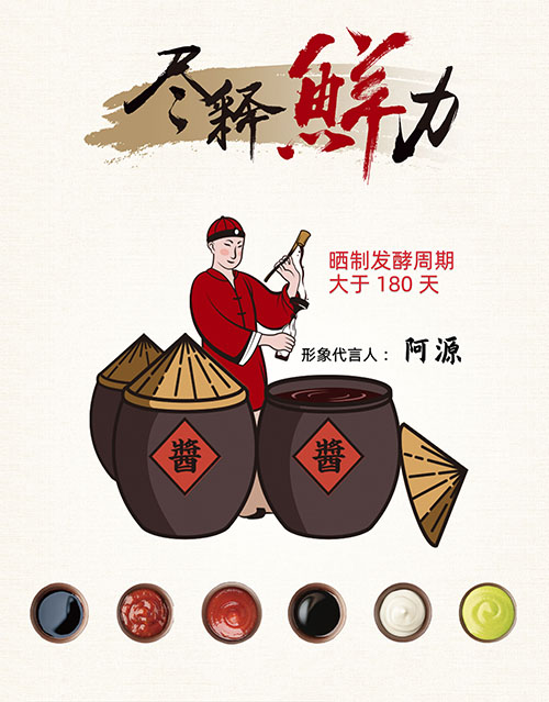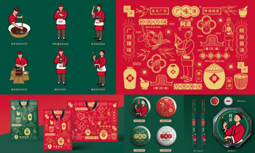 包裝上,廣味源將品牌視覺年輕化,結合年輕人喜歡的國潮文化元素打造了一套統(tǒng)一的視覺VI識別系統(tǒng),塑造IP阿源的形象,從品牌層面顛覆年輕人對于傳統(tǒng)醬油企業(yè)的刻板印象。