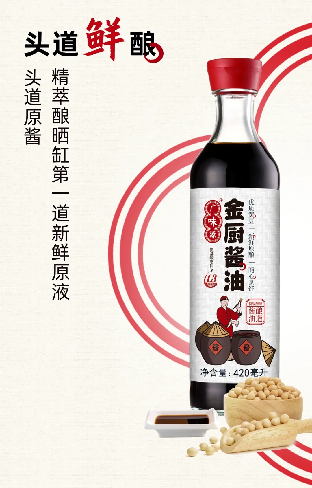 金廚近期推出一款高檔次“觀音瓶”獨(dú)特造型的醬油,它,不僅擁有醬油最原始的新鮮味,也讓我們的生活變得更加時(shí)尚“新鮮”。與其他醬油釀造技術(shù)不同,金廚醬油有著獨(dú)家的調(diào)配配方——“頭道新鮮釀·萃技術(shù)”。也就是說(shuō),它從黃豆釀造到頭道萃取,全程采用“新鮮釀·萃”,零添加,純粹無(wú)負(fù)擔(dān)。最后,精粹出釀曬缸第一道新鮮原液。這樣萃取出來(lái)的頭道原醬,鮮醇而不澀,讓你吃到醬油最自然的醇香!同時(shí),金廚醬油氨基酸態(tài)氮每100ml含量高達(dá)1.3g,營(yíng)養(yǎng)更豐富。